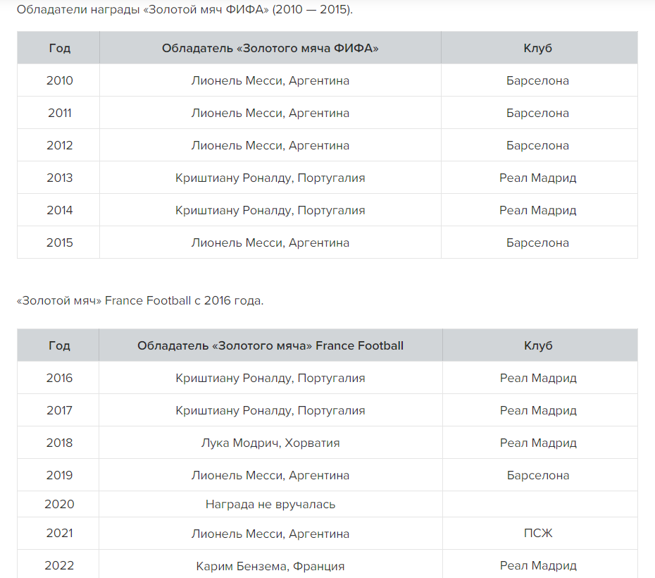 В прошлом веке чаще всего приз доставался немецким футболистам. В основном это были футболисты «Баварии». Затем пальма первенства ушла к испанцам. Если посмотреть статистику, то с 2010 года «Золотой мяч» регулярно присуждался Месси и Роналду. Лионель взял ее 6 раз, Криштиану – 4 раза. Кроме них, за последние два десятилетия, приз доставался один раз Луке Модричу из Хорватии и Кариму Бензема из Франции.