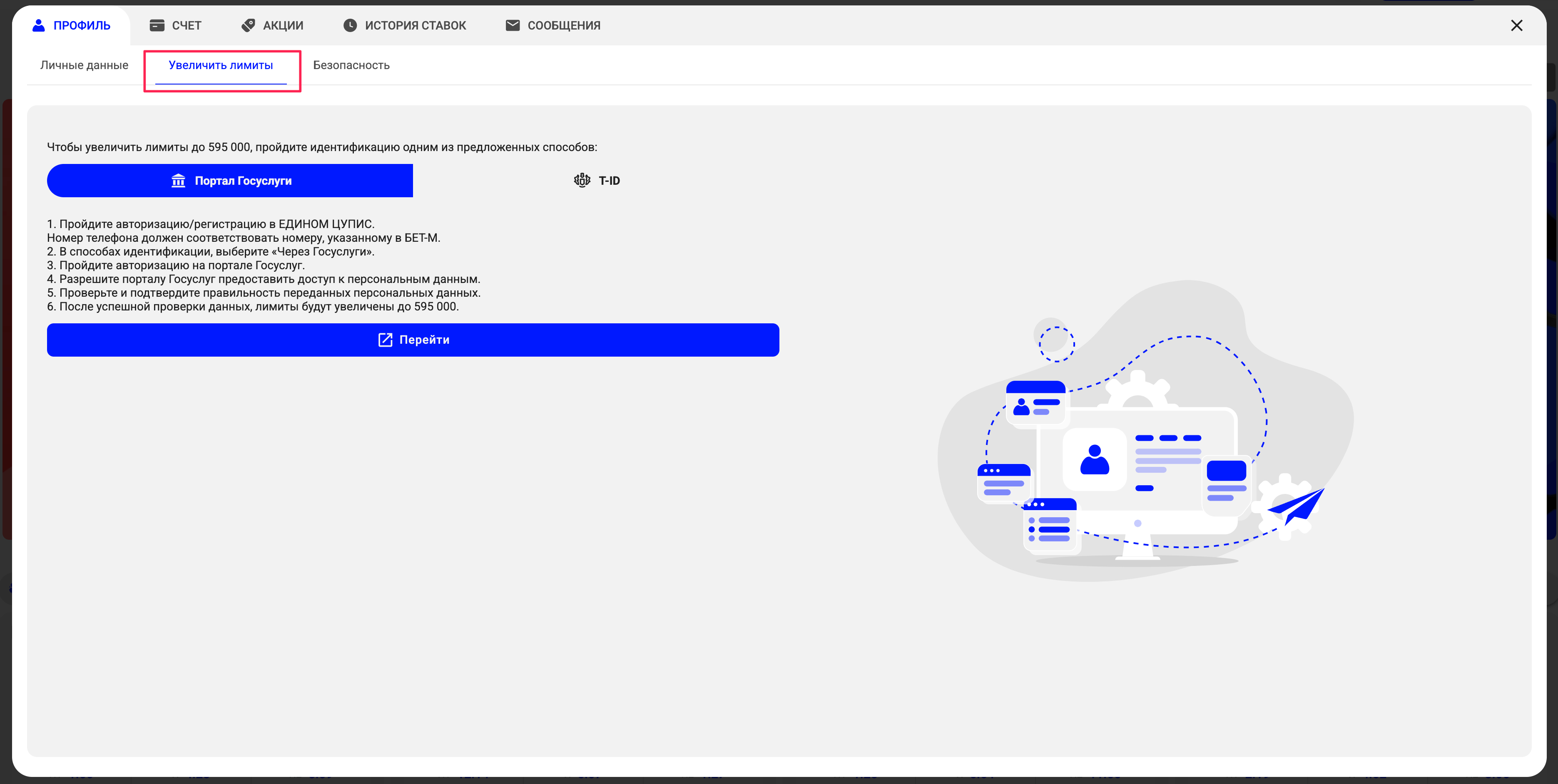 - В личном кабинете Bet-M выберите пункт «Идентификация через Т-ID».