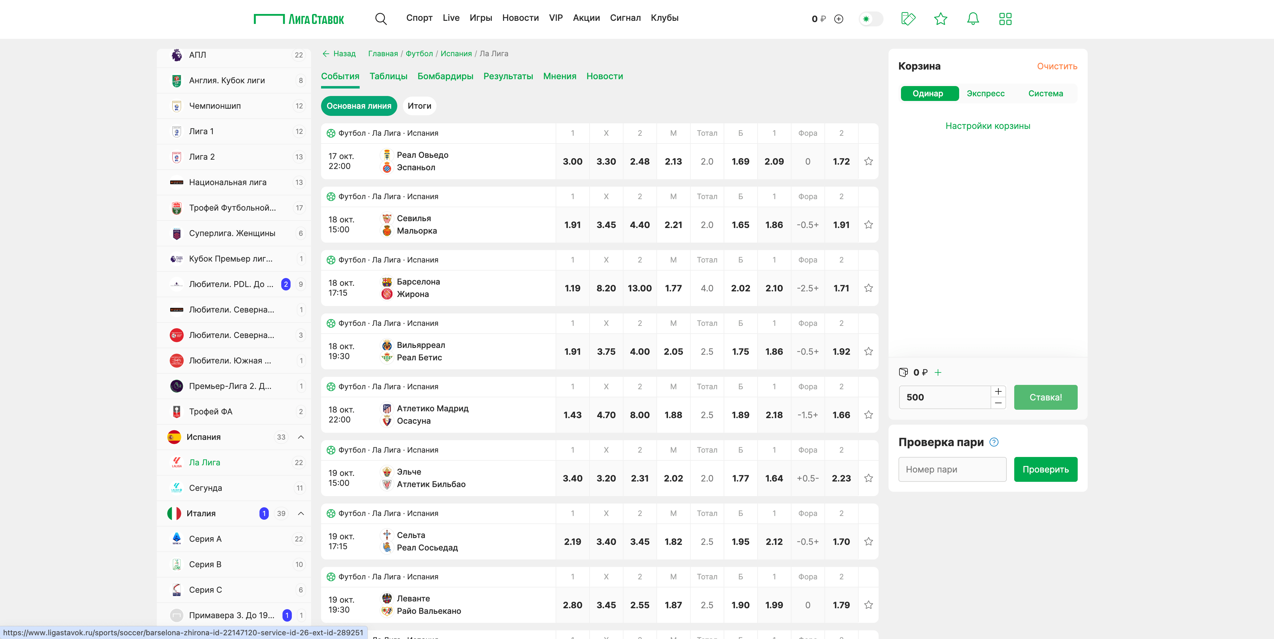 Выбор ставок в БК Лига Ставок