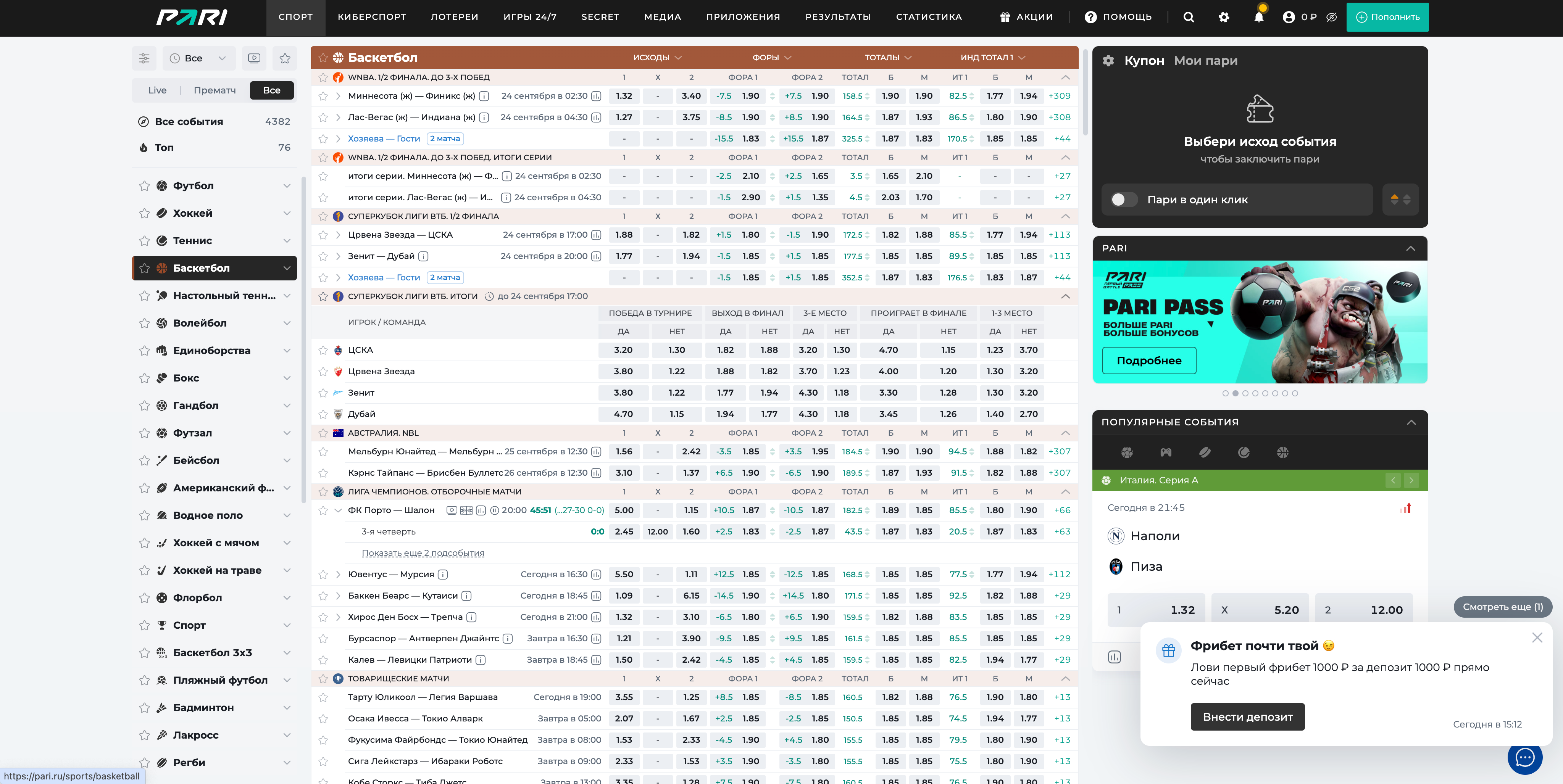 В БК «Пари» представлена высококачественная баскетбольная линия. Здесь игроки могут сделать ставку на такие ключевые события матча, как двух- и трёхочковые броски, штрафные, подбор мяча, пассы, перехват и блокшоты, а также на показатель точности реализованных бросков. Возможна покупка или продажа пунктов по тоталам и форам с неравномерным шагом изменения, без предоставления альтернативных линий.