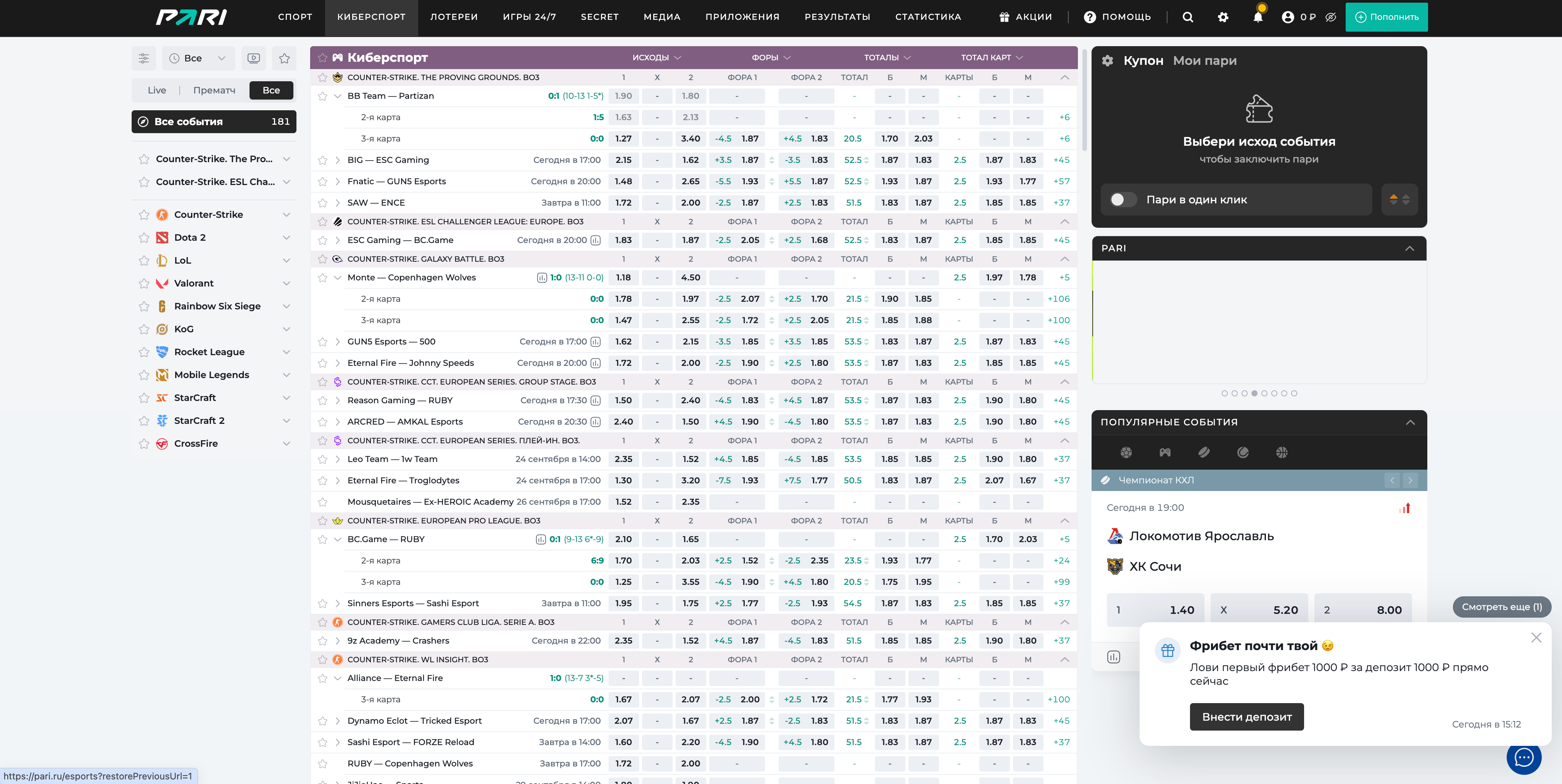 В букмекерской конторе «Пари» предлагается широкая линейка ставок на киберспорт, охватывающая наиболее популярные дисциплины и события:
