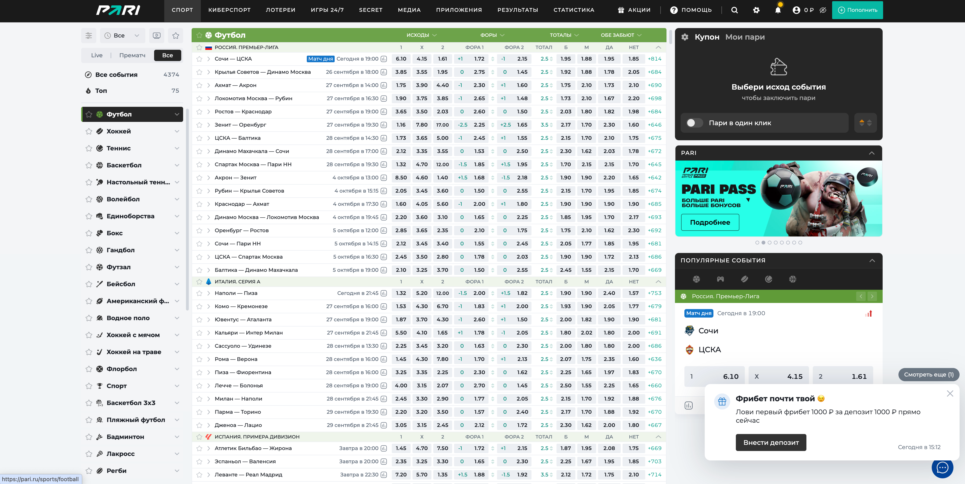 «Пари» отличается широким спектром возможных ставок на футбольные матчи. Помимо традиционных опций типа «забьёт игрок гол», здесь представлены дополнительные сценарии развития игры вокруг забитых мячей. Для ряда ведущих национальных первенств компания дополнительно вводит возможности поставить на статистику матча: угловые, жёлтые карточки, владение мячом, удары в створ, нарушения правил, аута и положения вне игры.