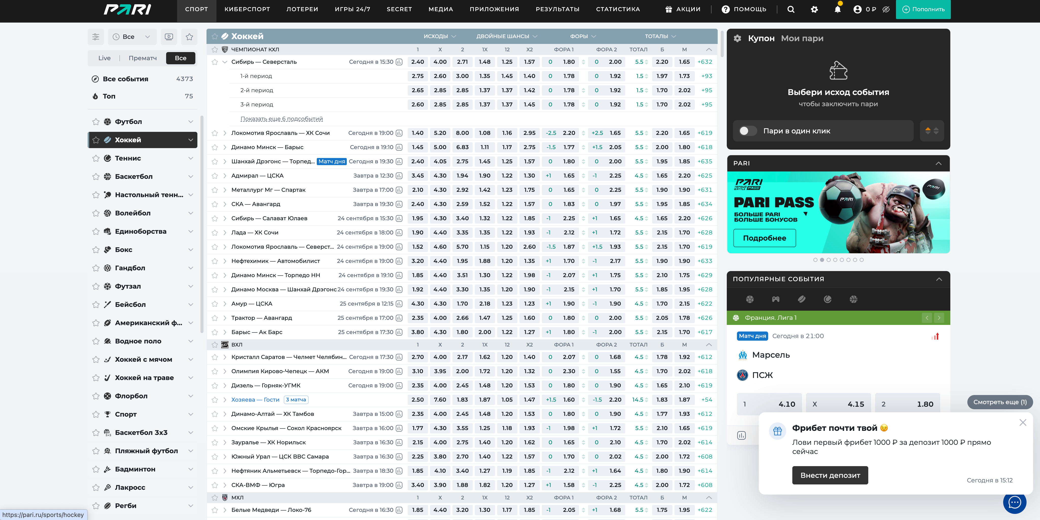 Роспись хоккейных матчей в Pari впечатляет своим масштабом и привлекательностью, превосходя многие предложения конкурентов. Компания предлагает полный спектр стандартных ставок на исход встречи, отдельную роспись на каждый период, широкий выбор индивидуальных тоталов, дополнительных тоталов и фор, прогнозы на автора первого гола и точное время последней шайбы, а также рынок «обе команды забьют».