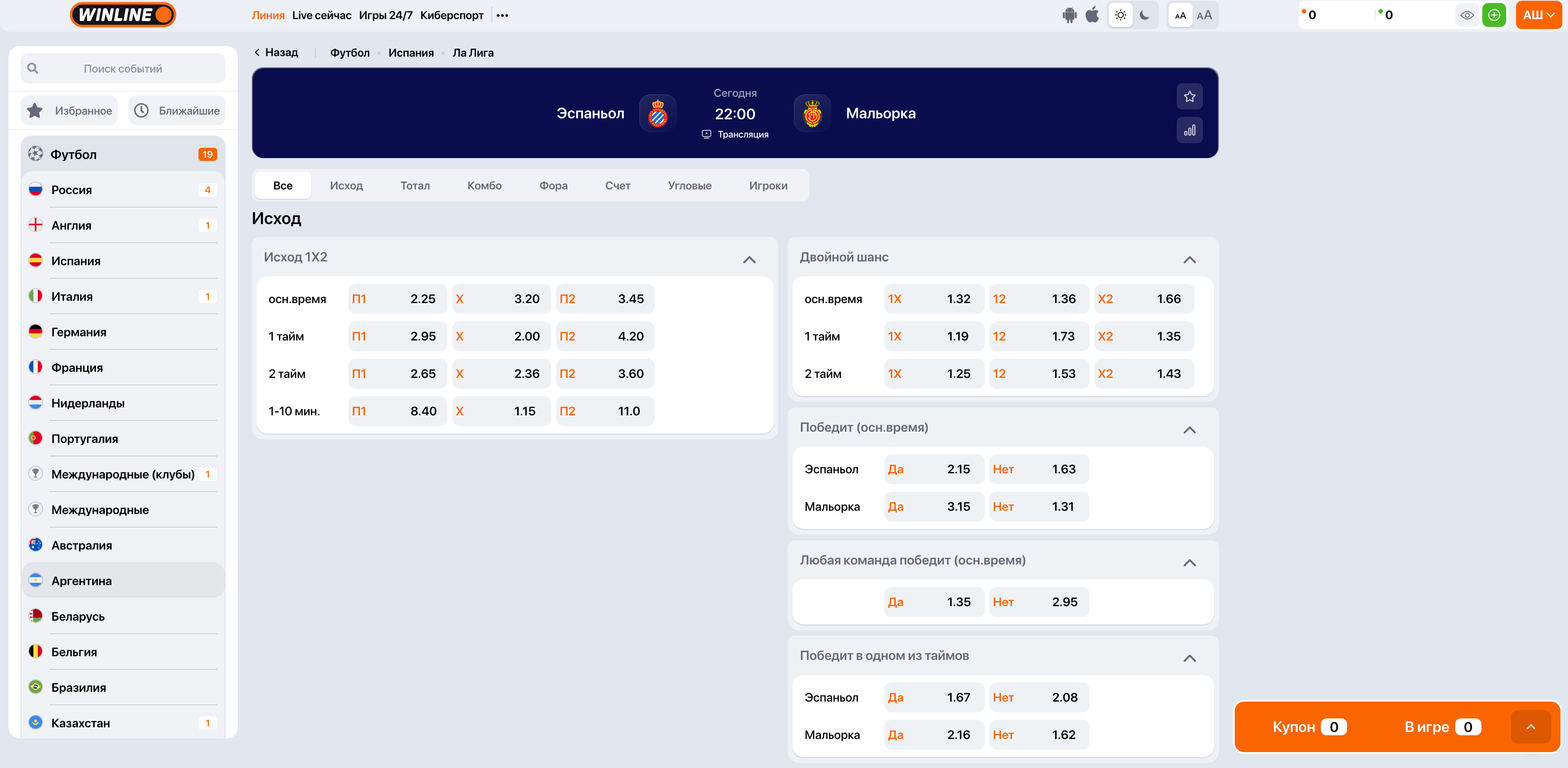 Качество росписи зависит от популярности матча. Например, на европейский или российский топ-чемпионат сайт Winline предлагает около 150 вариантов ставок. Самая лучшая роспись у РПЛ, АПЛ и ЛЧ.