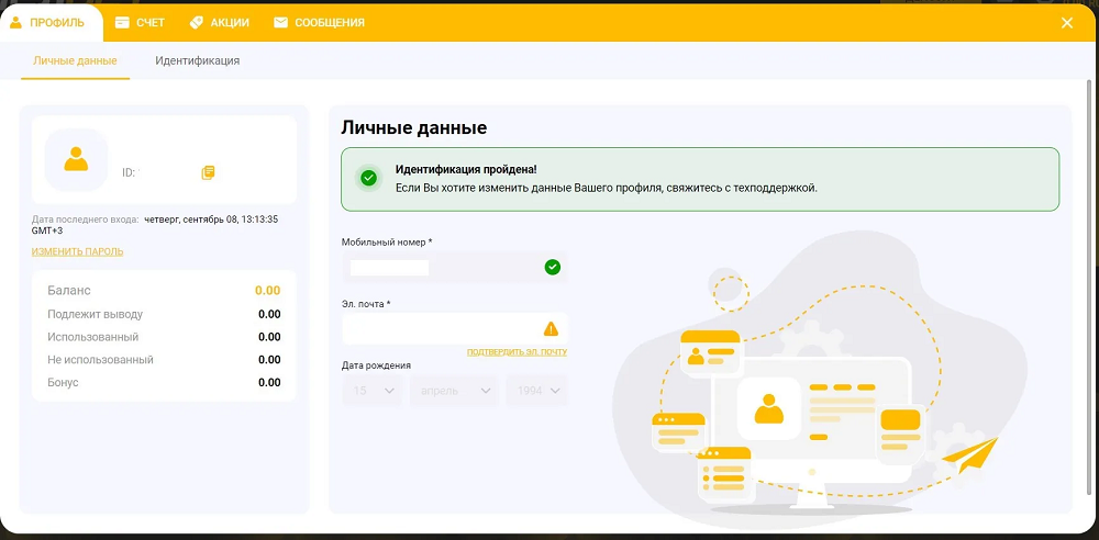После того как учетная запись создана, пользователь может перейти в учетную запись игрока. Для просмотра основного функционала личного кабинета, клиенту БК после авторизации на платформе следует нажать на id пользователя, после чего перед беттером появится перечень всех доступных ему функций: