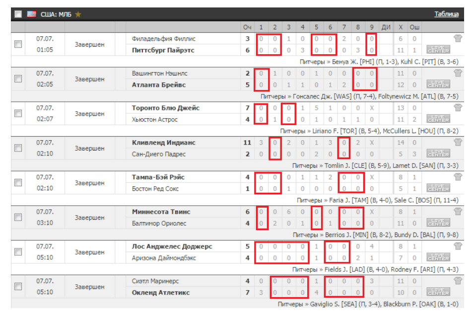 Ничья в иннинге. Хотя результат матча не может быть ничейным, но в рамках одного иннинга счет ноль-ноль встречается. Причем, не так уж и редко. Если посмотреть статистику соревнований, то можно увидеть, что периоды часто завершаются ничьей. В одном матче может быть до 5-6 таких итогов. Для большей уверенности подберите малорезультативные команды, в статистике которых нередки подобные результаты. Эта тактика подойдет даже новичкам, с ней можно делать ставки на бейсбол прямо сегодня.