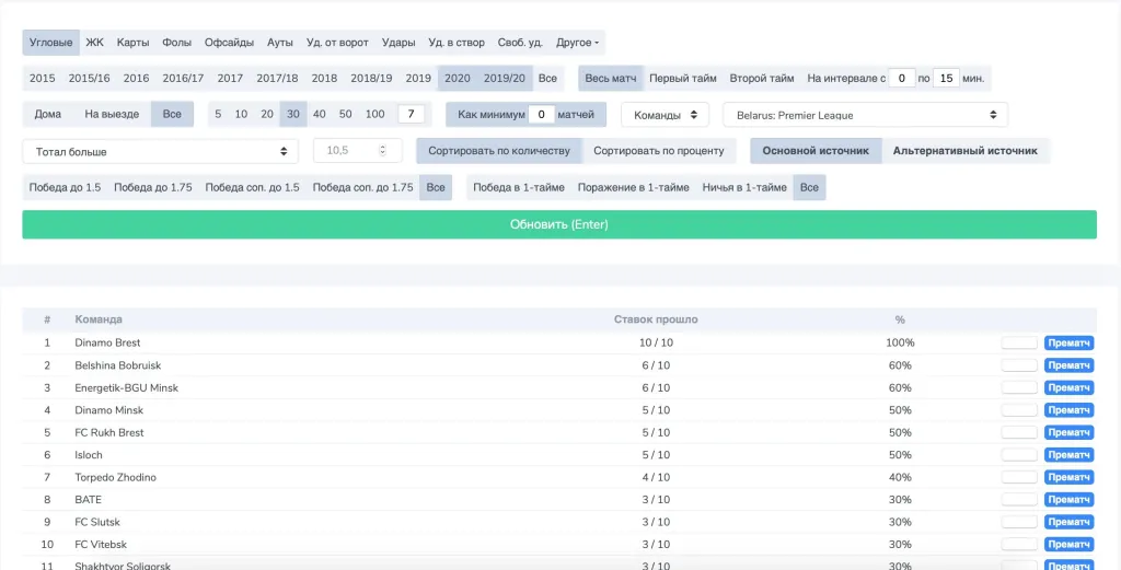 осуществляют предварительную заготовку трендов к предстоящему матчу/матчам (к примеру, конкретная команда пробивает в десяти из десяти игр определенное количество угловых (тоталы), что значительно отличается от среднего показателя по лиге);
