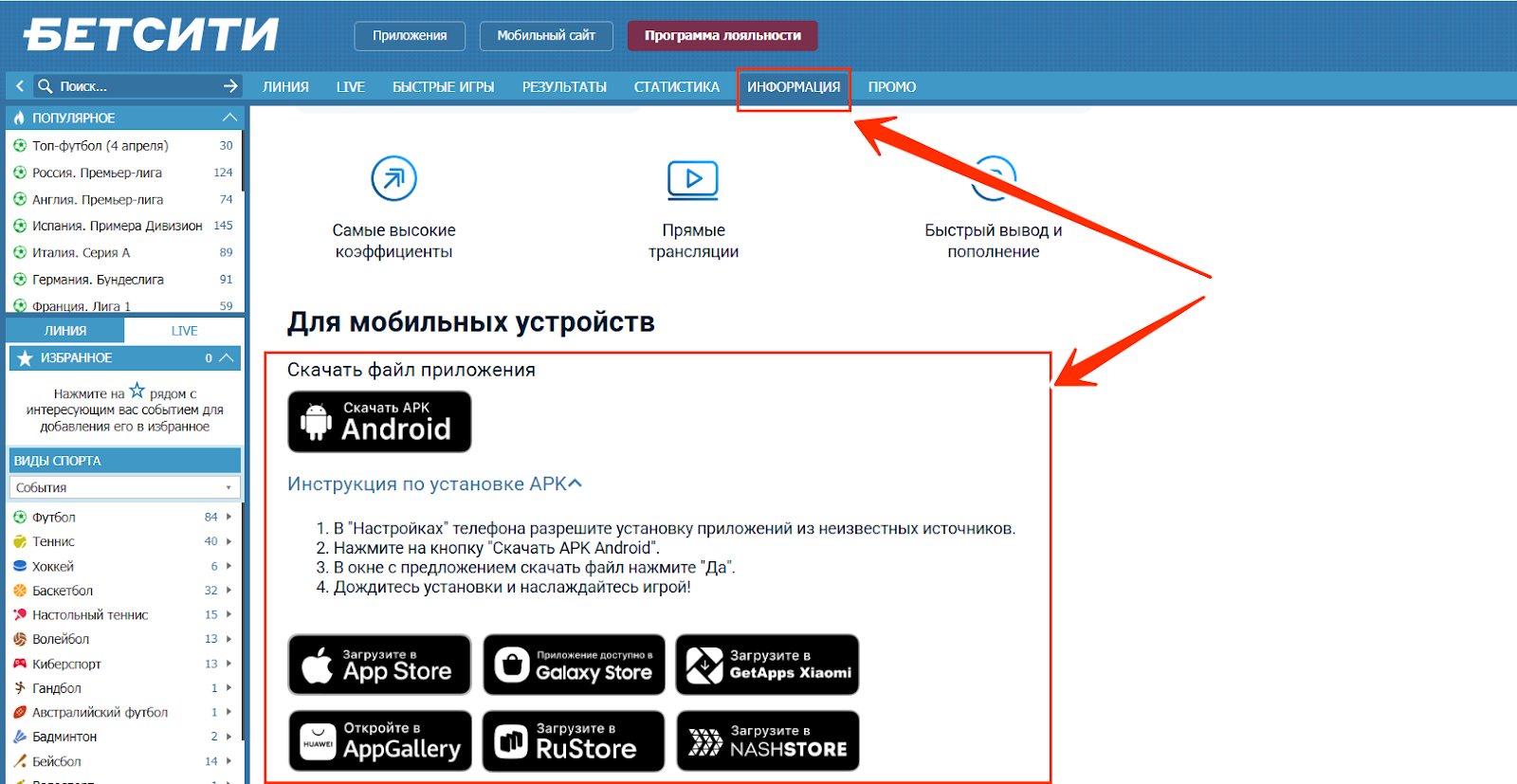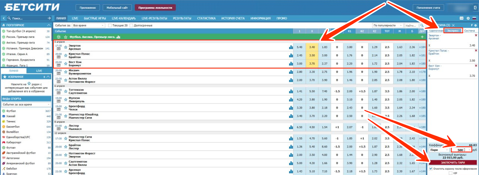 Делать в БК Бетсити ставки довольно легко. Навигация сайта и мобильного приложения очень простая, она понятна даже новичку. Вот последовательность действий: