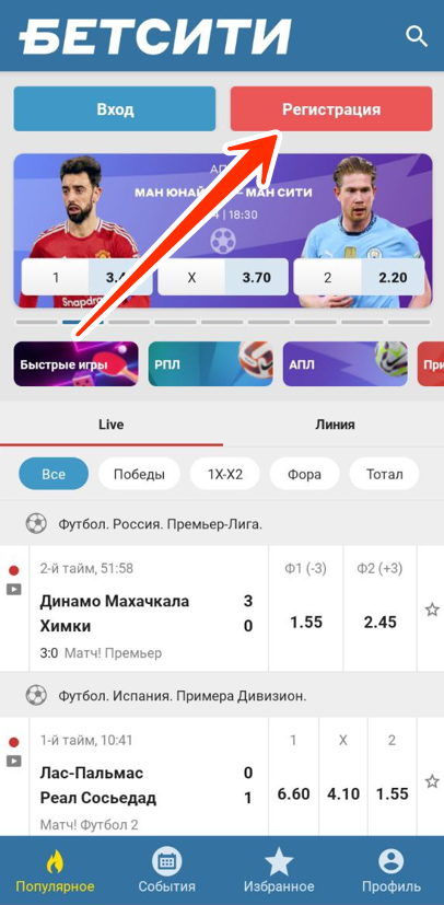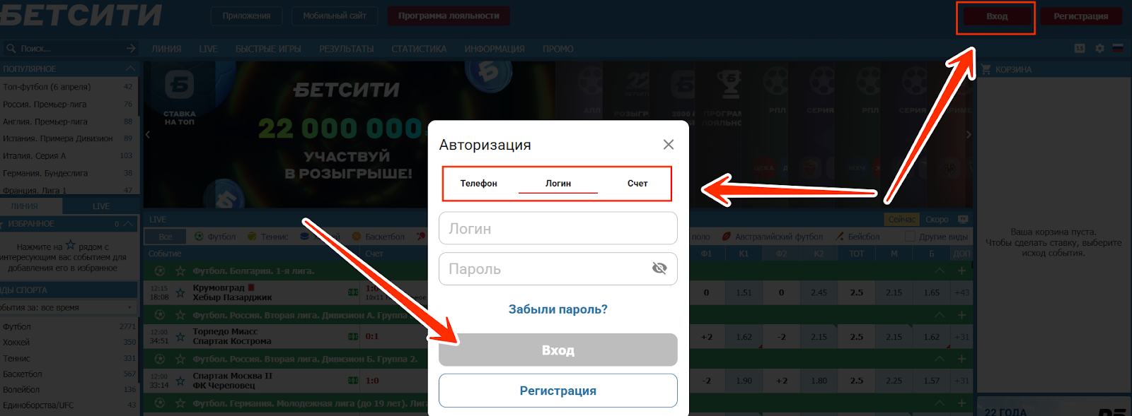 - Зайдите на Betcity официальный сайт или приложение, авторизуйтесь там.