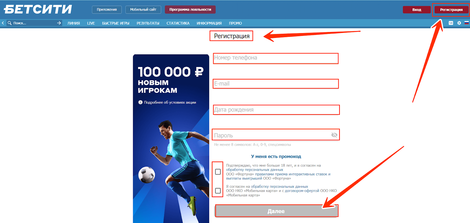 Чтобы пройти регистрацию на сайте или в приложении Бетсити необходимо указать следующую информацию: