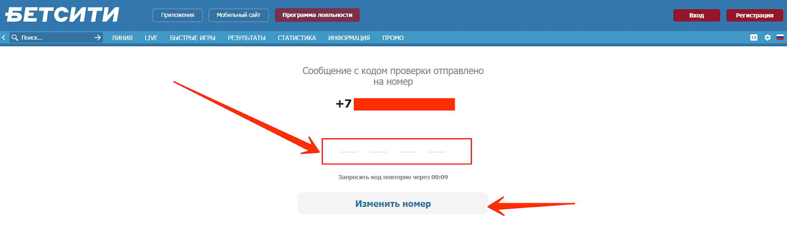 Если не пришло SMS или письмо на электронную почту, необходимо запросить повторное через службу поддержки БК Betcity.