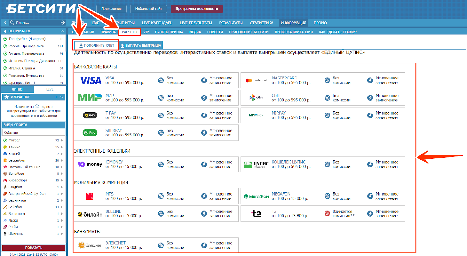 На официальном сайте БК Бетсити указаны все данные по депозиту возле каждой платежной системы: