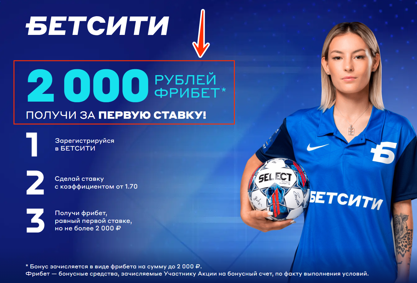 Бонус за первую ставку. Заключите первое пари в букмекерской конторе Бетсити с коэффициентом не ниже 1,70 и получите от букмекера фрибет, равный первой ставке до 2000 рублей.