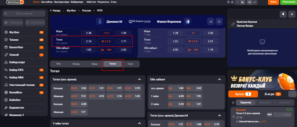 Для того, чтобы начать делать ставки на тотал в БК Винлайн, игроку следует авторизоваться на сайте компании, после чего выбрать подходящую спортивную дисциплину и событие в линии (прематч или лайв).